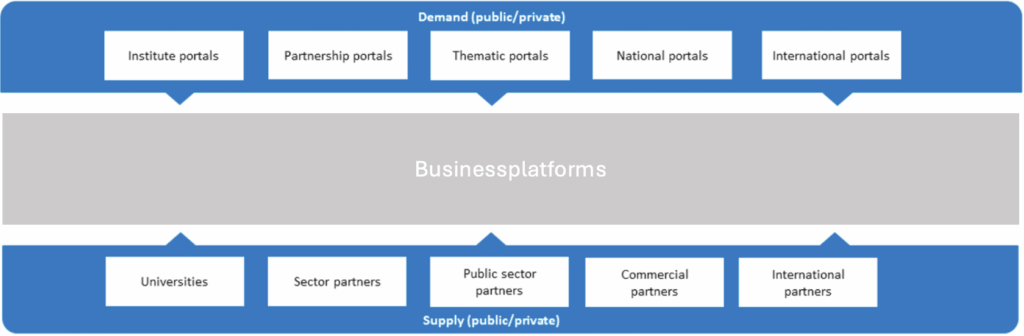 Ontwikkelingen in onderwijs en onderzoek vragen in toenemende mate om uitwisseling tussen verschillende partijen, zoals studenten, docenten, onderzoekers, bedrijven, overheden en burgers. Het gaat dan om uitwisseling van bijvoorbeeld data en voorzieningen. Businessplatforms in het onderwijsdomein faciliteren deze interactie en samenwerking, brengen vraag en aanbod bij elkaar en sturen op gezamenlijke waarden en normen. Schematisch is dit concept weergegeven in onderstaande afbeelding.